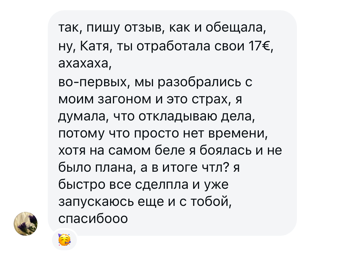 "во-первых, мы разобрались с моим загоном и это - страх, я думала, что откладываю дела, потому что просто нет времени, хотя на самом деле я боялась и не было плана, а в итоге, что? я быстро все сделала и уже запускаюсь!"