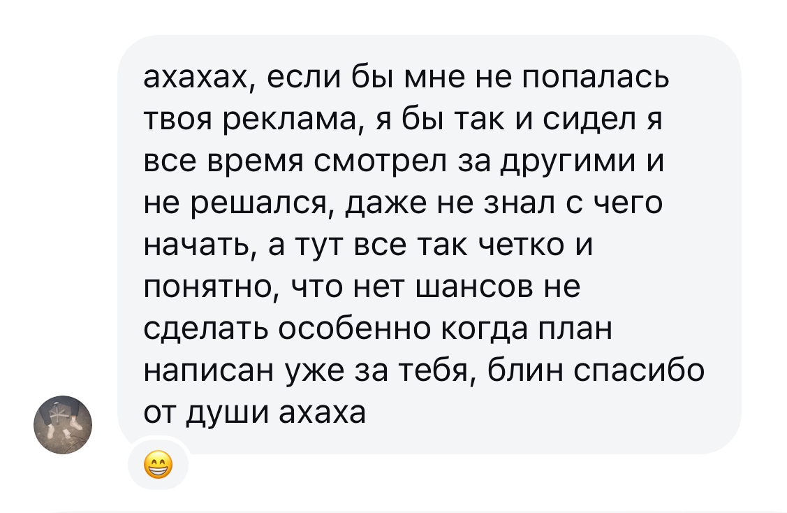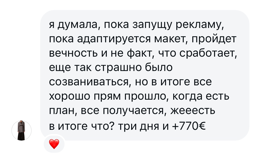 "я думала, пока запущу рекламу, пока адаптируется макет, пройдет вечность и не факт, что сработает, еще так страшно было созваниваться, но когда есть план, все получается, жеесть"